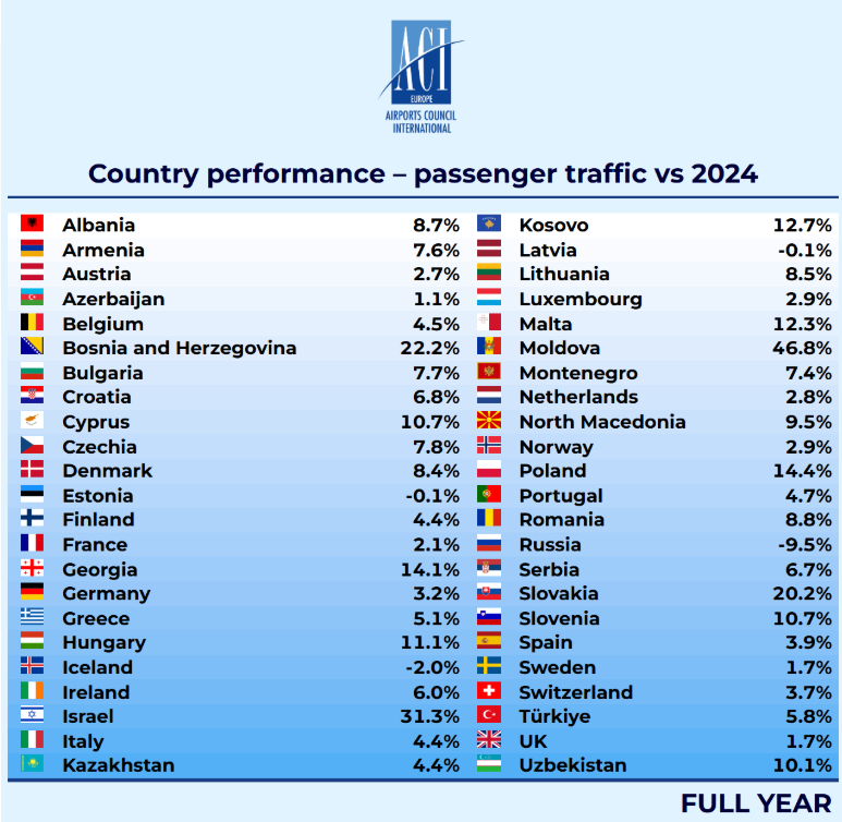 Μεγαλύτερη αύξηση από τα κυπριακά αεροδρόμια παρουσίασαν μόνο τα αεροδρόμια της Σλοβακίας (+20,2%), της Πολωνίας (+14,4%), της Ουγγαρίας (+11,1%) της Σλοβενίας (+10,7%) και της Μάλτας (+12,3%), με ητν Κύπρο να ακολουθεί στην έκτη θέση (+10,7%).