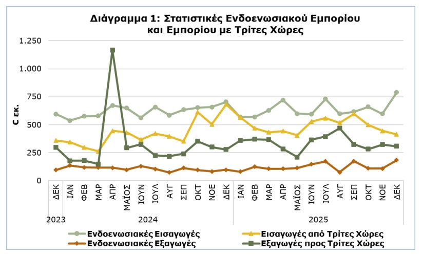 Οι συνολικές εισαγωγές αγαθών για την περίοδο Ιανουαρίου–Δεκεμβρίου 2025 ήταν €13.551,8 εκ. σε σύγκριση με €12.582,0 εκ. για την περίοδο Ιανουαρίου–Δεκεμβρίου 2024, σημειώνοντας αύξηση 7,7%. Οι συνολικές εξαγωγές αγαθών για την περίοδο Ιανουαρίου–Δεκεμβρίου 2025 ήταν €5.550,4 εκ. σε σύγκριση με €5.186,7 εκ. για την περίοδο Ιανουαρίου–Δεκεμβρίου 2024, σημειώνοντας αύξηση 7,0%. Το έλλειμμα του εμπορικού ισοζυγίου ήταν €8.001,4 εκ. για την περίοδο Ιανουαρίου–Δεκεμβρίου 2025 σε σύγκριση με €7.395,3 εκ. την αντίστοιχη περίοδο του 2024.