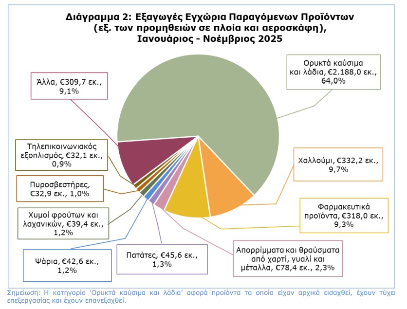 Οι κυριότερες κατηγορίες εξαγωγών εγχώρια παραγόμενων προϊόντων κατά την περίοδο Ιανουαρίου-Νοεμβρίου 2025 (εξ. των προμηθειών σε πλοία και αεροσκάφη), ήταν τα ορυκτά καύσιμα και λάδια με αξία €2.188,0 εκ., το χαλλούμι με αξία €332,2 εκ. και τα φαρμακευτικά προϊόντα με αξία €318,0 εκ.