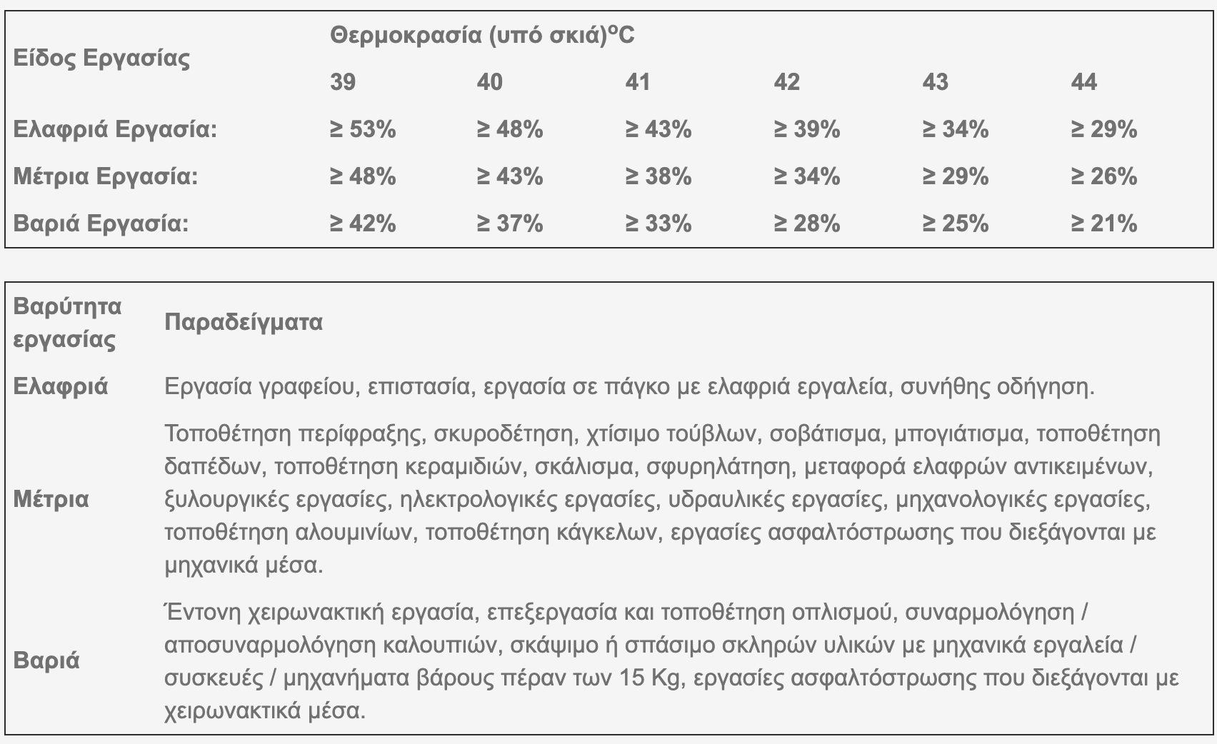 Όπως προστίθεται σύμφωνα με τις πρόνοιες του Κώδικα Πρακτικής, για συνθήκες θερμοκρασίας 39ο έως 44ο, πρέπει να διακόπτονται οι εργασίες όταν επικρατούν συγκεκριμένα ποσοστά υγρασίας, ανάλογα με το είδος και τη βαρύτητα της εργασίας.