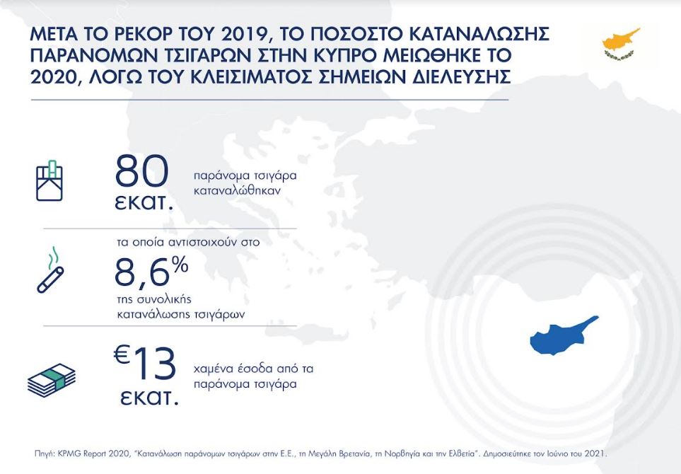 Σύμφωνα με τη νέα, ετήσια, ανεξάρτητη έρευνα της KPMG, που διενεργήθηκε για λογαριασμό της Philip Morris International (PMI), το ποσοστό κατανάλωσης παράνομων τσιγάρων στην Κύπρο μειώθηκε το 2020 στο 8,6%. Αξίζει να σημειωθεί ότι, παρά την πτώση που παρατηρείται σε σχέση με το 2019, οι απώλειες των κρατικών ταμείων συνεχίζουν να είναι υψηλές και να ανέρχονται στα 13 εκατομμύρια ευρώ έναντι 28 εκατομμυρίων το 2019. Ιδιαίτερο ενδιαφέρον, επίσης, παρουσιάζει το γεγονός ότι οι ροές από τις κατεχόμενες περιοχές, που αποτέλεσαν την κύρια πηγή παράνομων τσιγάρων το 2019, περιορίστηκαν αρκετά το 2020 χάρη και στα μέτρα που ελήφθησαν στο πλαίσιο διαχείρισης της πανδημίας.