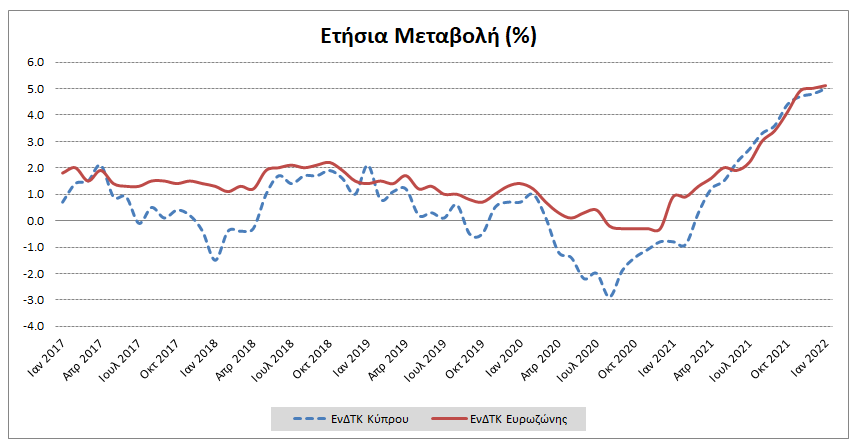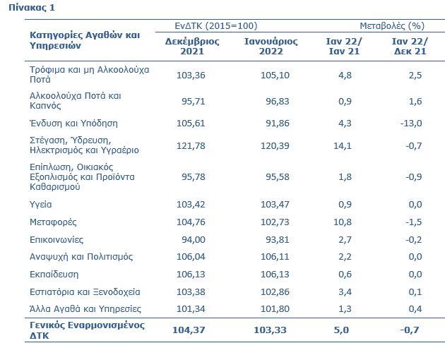 Σύμφωνα με την Στατιστική Υπηρεσία ο Εναρμονισμένος Δείκτης Τιμών Καταναλωτή τον Ιανουάριο 2022 αυξήθηκε κατά 5,0% σε σχέση με τον Ιανουάριο του 2021, ενώ σε σχέση με τον προηγούμενο μήνα μειώθηκε κατά 0,7%. (Πίνακας 1)