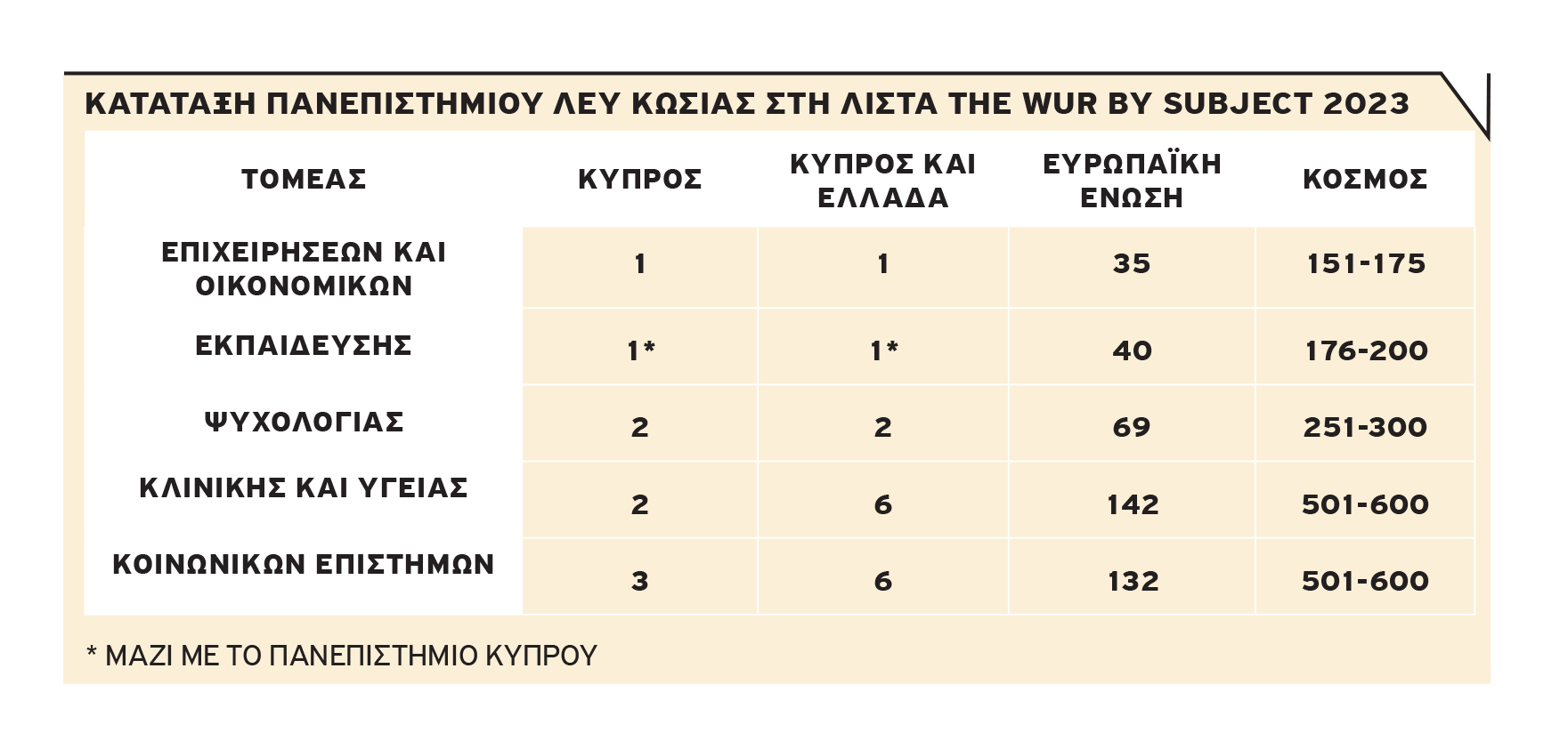 Tα αποτελέσματα της ετήσιας κατάταξης του Times Higher Education (THE) World University Rankings by Subject 2023 ενισχύουν τη θέση του Πανεπιστημίου Λευκωσίας διεθνώς στον τομέα των Επιχειρήσεων και Οικονομικών και στον τομέα της Εκπαίδευσης. Συγκεκριμένα, το Πανεπιστήμιο Λευκωσίας κατατάσσεται μεταξύ των 151–175 καλύτερων πανεπιστημίων παγκοσμίως στον τομέα των Επιχειρήσεων και Οικονομικών και μεταξύ των 176–200 καλύτερων πανεπιστημίων παγκοσμίως στον τομέα της Εκπαίδευσης.