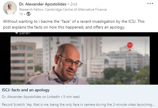 Με νέα του ανάρτηση στην πλατφόρμα κοινωνικής δικτύωσης X (πρώην Twitter), ο Δρ. Αποστολίδης ενημέρωσε πως το ICIJ προχώρησε εν τέλει σε αλλαγή του βίντεο.