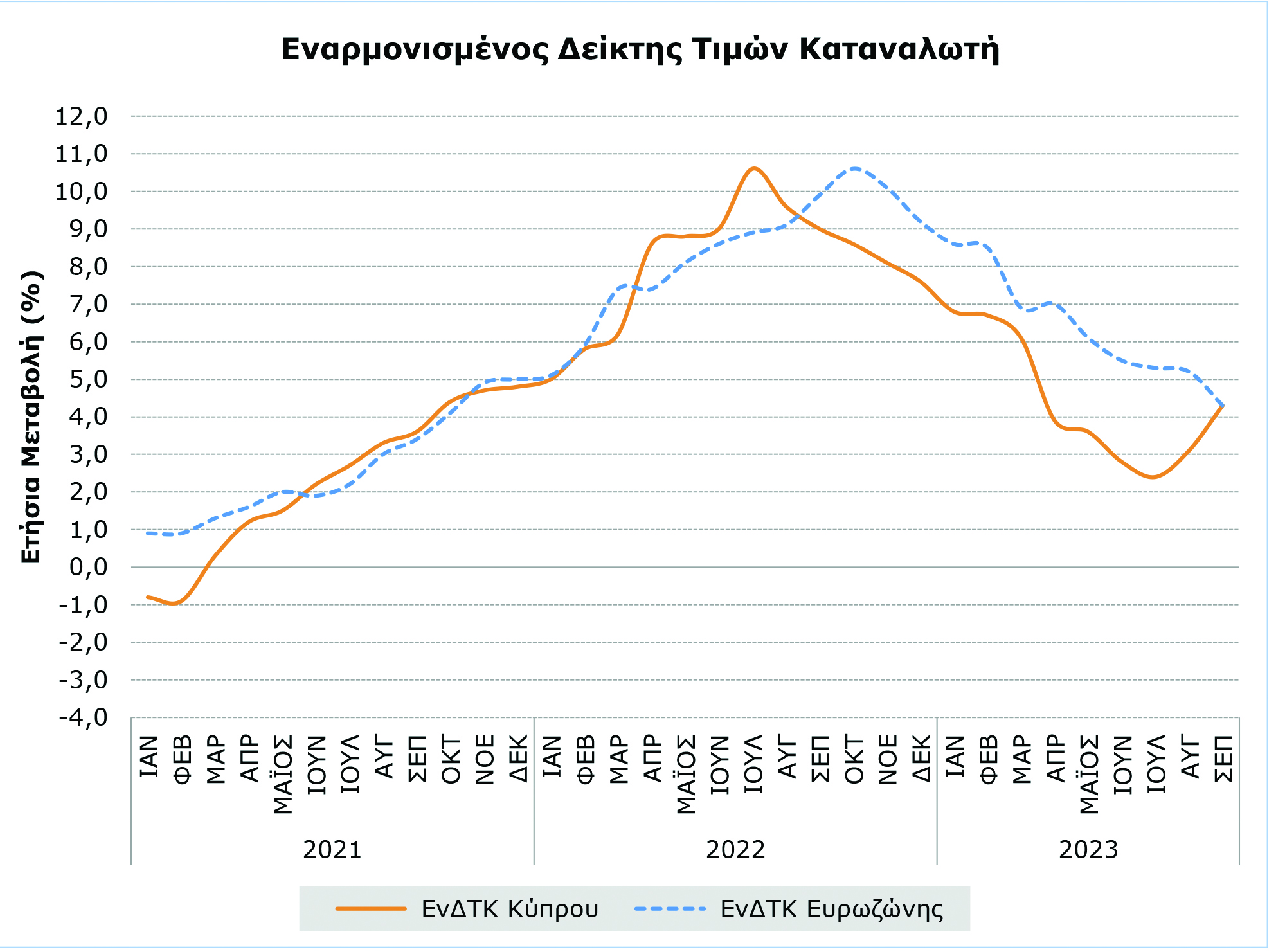 Η Στατιστική Υπηρεσία στη μηνιαία έκθεσή της για τον πληθωρισμό (Δείκτης Τιμών Καταναλωτή) για τον Σεπτέμβρη καταγράφει πληθωρισμό 4% και στο 4,3% σε ετήσια βάση και σημειώνει ότι η μεγαλύτερη θετική μεταβολή συγκριτικά με τον Σεπτέμβριο του 2022 καταγράφηκε στα γεωργικά προϊόντα με ποσοστό 15,2% και σε σχέση με τον προηγούμενο μήνα, η μεγαλύτερη μεταβολή παρουσιάστηκε στα Πετρελαιοειδή με ποσοστό 5,1%. Συγκριτικά με τον Σεπτέμβριο του 2022, η μεγαλύτερη θετική μεταβολή παρατηρήθηκε στην κατηγορία Τροφίμων και μη Αλκοολούχων Ποτών 9,7%. Σε σχέση με τον Αύγουστο του 2023, η μεγαλύτερη μεταβολή παρατηρήθηκε στην κατηγορία Ένδυσης και Υπόδηση(7,8%). Τέλος για την περίοδο Ιανουαρίου - Σεπτεμβρίου 2023, σε σύγκριση με την αντίστοιχη περσινή περίοδο, οι μεγαλύτερες μεταβολές παρουσιάστηκαν στις κατηγορίες Τροφίμων και μη Αλκοολούχων ποτών (9,1%), Εστιατόρια και Ξενοδοχεία (6,1%) και Στέγαση, Ύδρευση, Ηλεκτρισμός και Υγραέριο (5,8%).