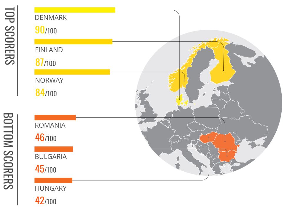 Στον αντίποδα, η Δανία (90 βαθμοί) καταλαμβάνει την πρώτη θέση στον δείκτη για έκτη συνεχόμενη χρονιά, με τη Φινλανδία και τη Νέα Ζηλανδία να ακολουθούν με βαθμολογία 87 και 85, αντίστοιχα. Λόγω της εύρυθμης λειτουργίας των δικαιοδοτικών συστημάτων τους, αυτές οι χώρες βρίσκονται επίσης μεταξύ των κορυφαίων της βαθμολογίας του Δείκτη για το Κράτος Δικαίου.