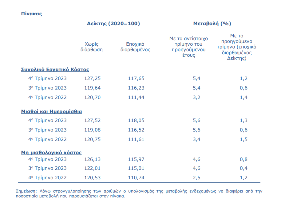 Αύξηση του ωριαίου εργατικού κόστους το τέταρτο τρίμηνο του 2023, κατά 5,4%, σε σύγκριση με το αντίστοιχο τρίμηνο του προηγούμενου έτους κατέγραψε η Στατιστική Υπηρεσία. Ειδικότερα, επισημαίνεται ότι οι δύο συνιστώσες του εργατικού κόστους, οι μισθοί και τα ημερομίσθια ανά ώρα εργασίας και το μη μισθολογικό κόστος ανά ώρα εργασίας, σημείωσαν αύξηση 5,6% και 4,6% αντίστοιχα, σε σύγκριση με το αντίστοιχο τρίμηνο του προηγούμενου έτους.