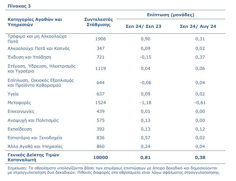 Τη μεγαλύτερη θετική επίδραση στη μεταβολή του ΔΤΚ του Σεπτεμβρίου 2024 σε σχέση με τον Σεπτέμβριο του 2023 είχαν οι κατηγορίες Τρόφιμα και μη Αλκοολούχα Ποτά (0,90) και Εστιατόρια και Ξενοδοχεία (0,57).