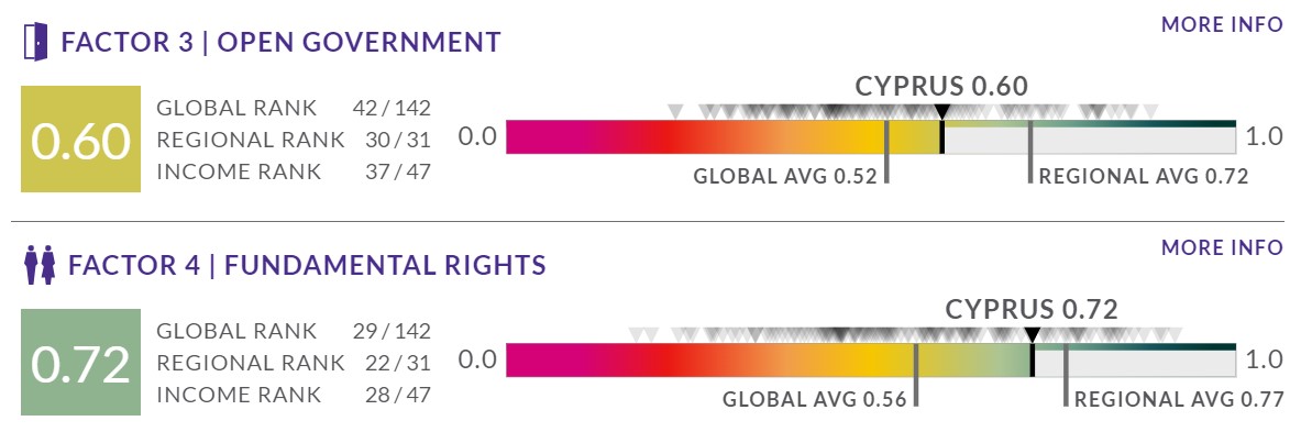 Σε ό,τι αφορά την ανοιχτή διακυβέρνηση, η Κύπρος είναι 42η από 142 χώρες παγκοσμίως, 30ή από 31 χώρες σε περιφερειακό επίπεδο και 37η από 47 χώρες στο ύψος των εισοδημάτων. Ως προς τα θεμελιώδη δικαιώματα, η χώρα κατατάσσεται στην 29η θέση από 142 χώρες παγκοσμίως, 22η από 31 χώρες σε περιφερειακό επίπεδο και 28η από 47 χώρες στο ύψος των εισοδημάτων. Ως προς την τάξη και ασφάλεια, η Κύπρος είναι 44η από 142 χώρες παγκοσμίως, 26η από 31 χώρες σε περιφερειακό επίπεδο και 35η από 47 χώρες στο ύψος των εισοδημάτων.